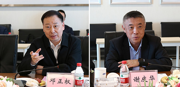 遂寧市市長鄧正權(quán)、中電科技董事長謝慶華在座談會上探討交流